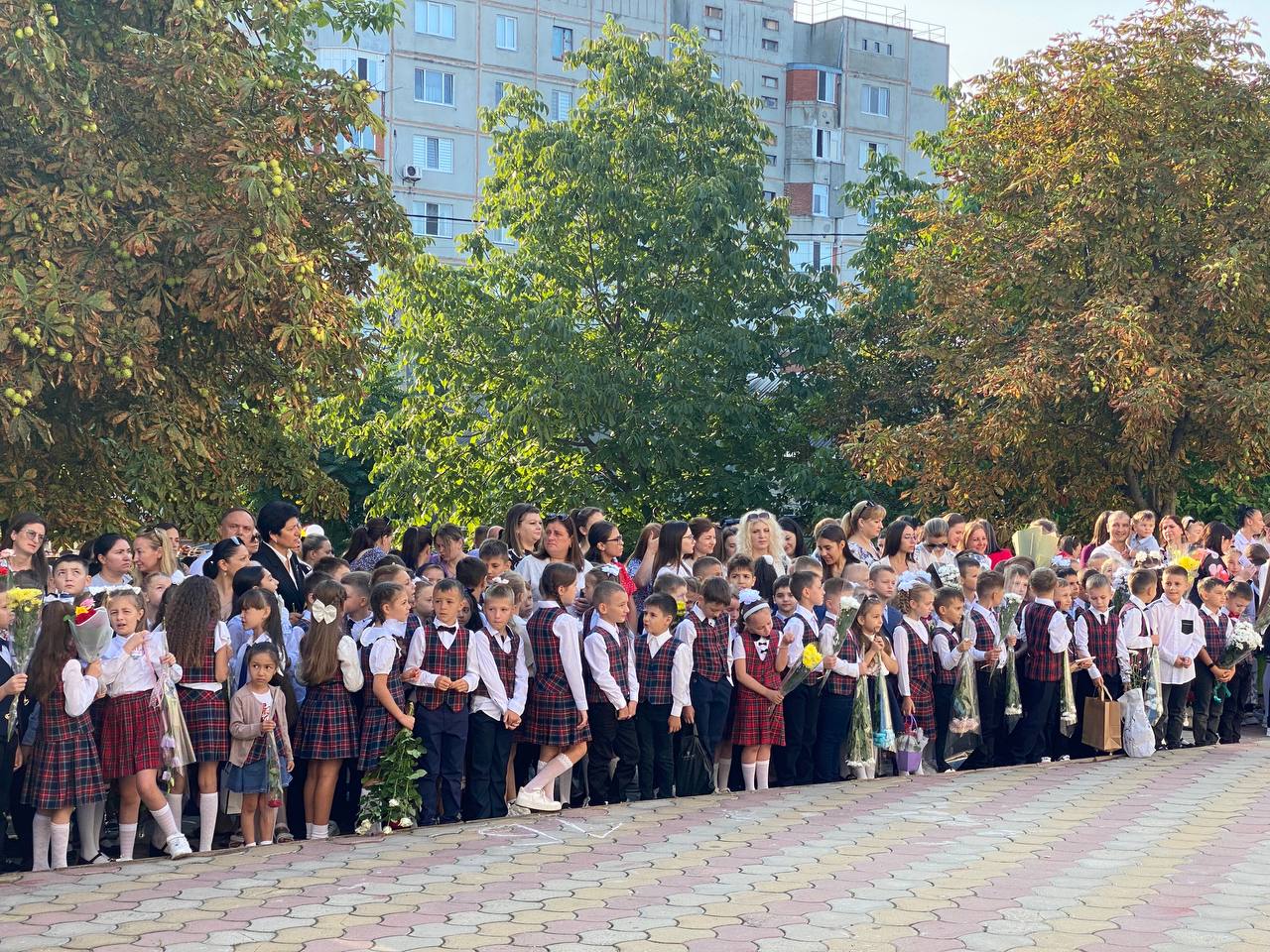 Учащиеся, родители и гости теоретического лицея имени Гавриила Гайдаржи на торжественной линейке в честь Дня знаний. Комрат, 1 сентября.
